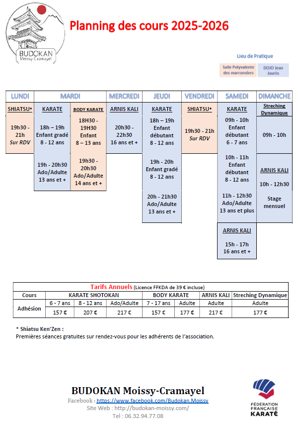Voici le nouveau Flyer Budokan Visuel 2025-2026 avec les horaires des cours de nos disciplines.